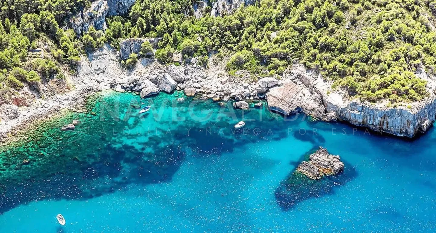Cala D’Aubarca con su característica gran herradura. Sus sorprendente bahía de aguas cristalinas y con un profundo color turquesa. Denominada la bahía ideal para la practica del snorkel y el buceo.