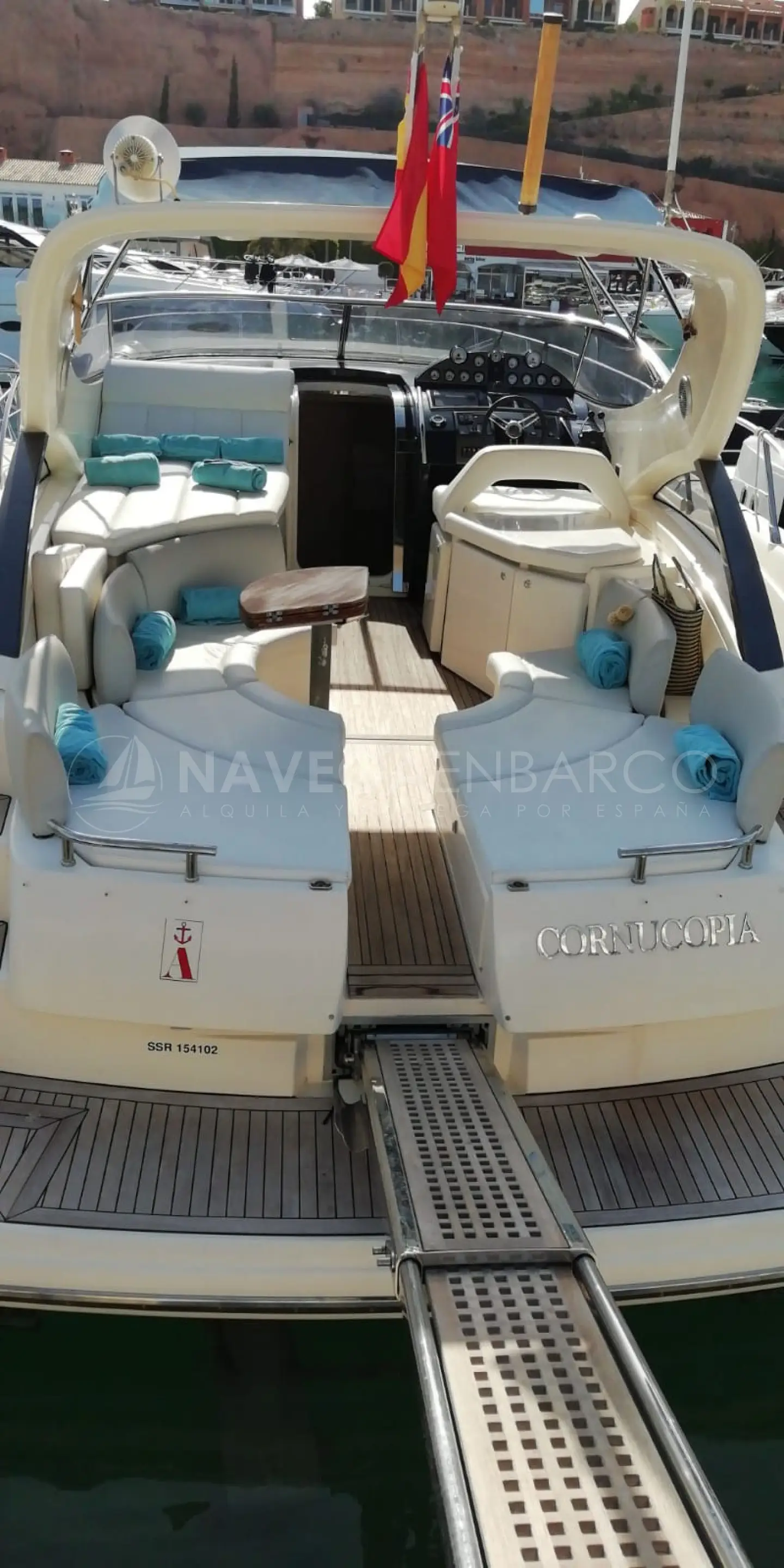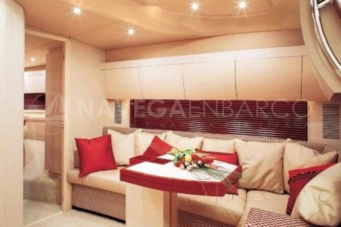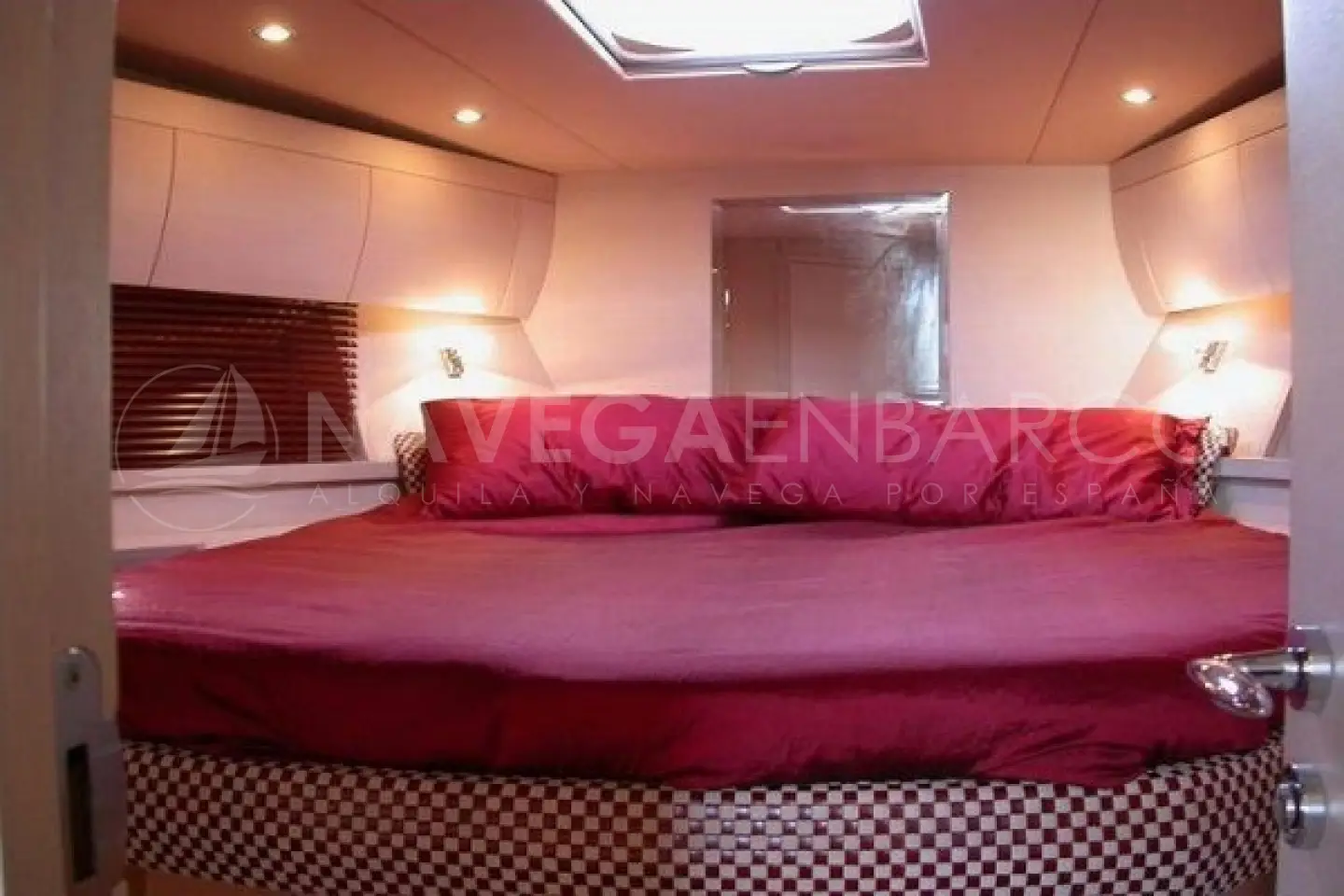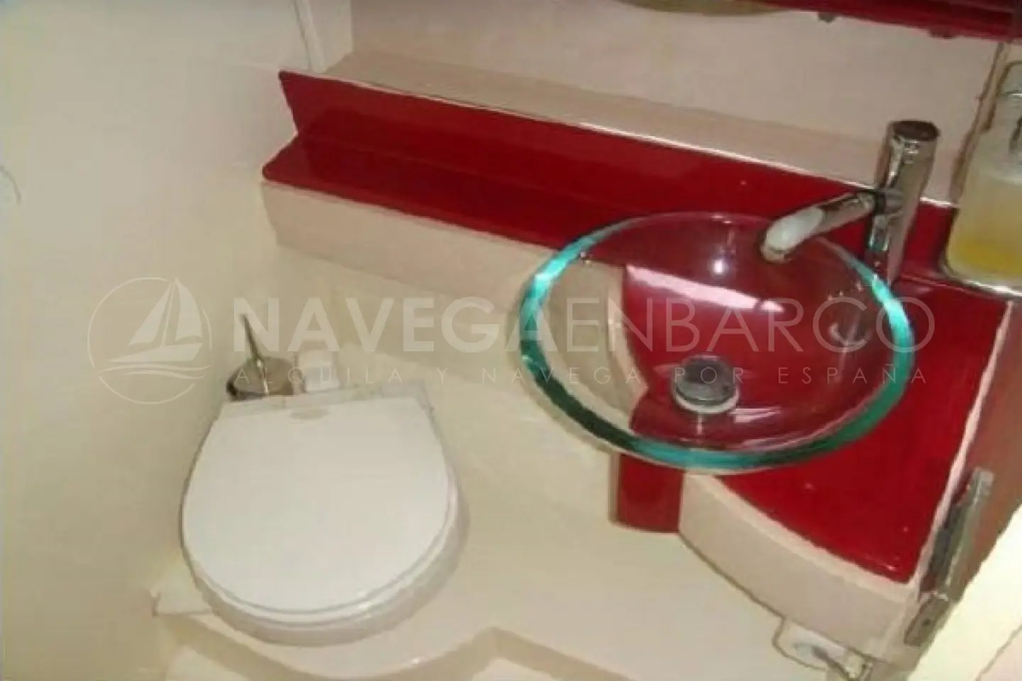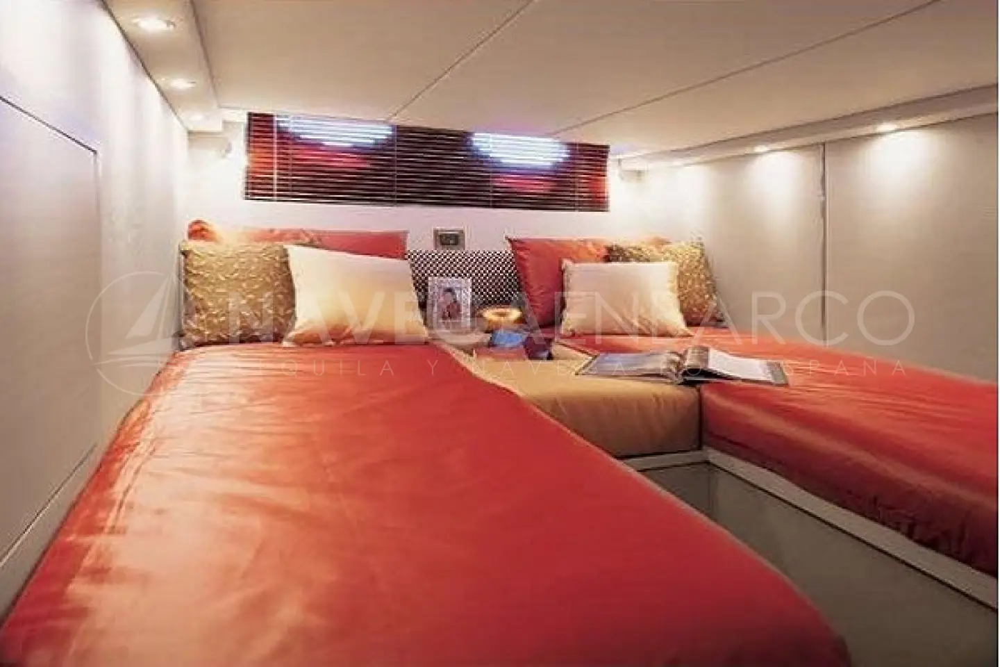 En la proa hay un solárium de 2 metros, donde se puede disfrutar de la música para maravillarse con la puesta de sol. En la popa del yate hay otra zona de asientos con mesa de comedor para 6 - 8 personas que se abre a la plataforma de baño con escaleras de mano hasta el mar. En el interior del yate hay 2 camarotes, una con cama de matrimonio y otra con 2 camas individuales, ambos con su propio cuarto de baño con ducha. La cocina está equipada para prepararse la comida y las bebidas que usted decida tener a bordo. El equipo de entretenimiento a bordo incluye sistema de música.