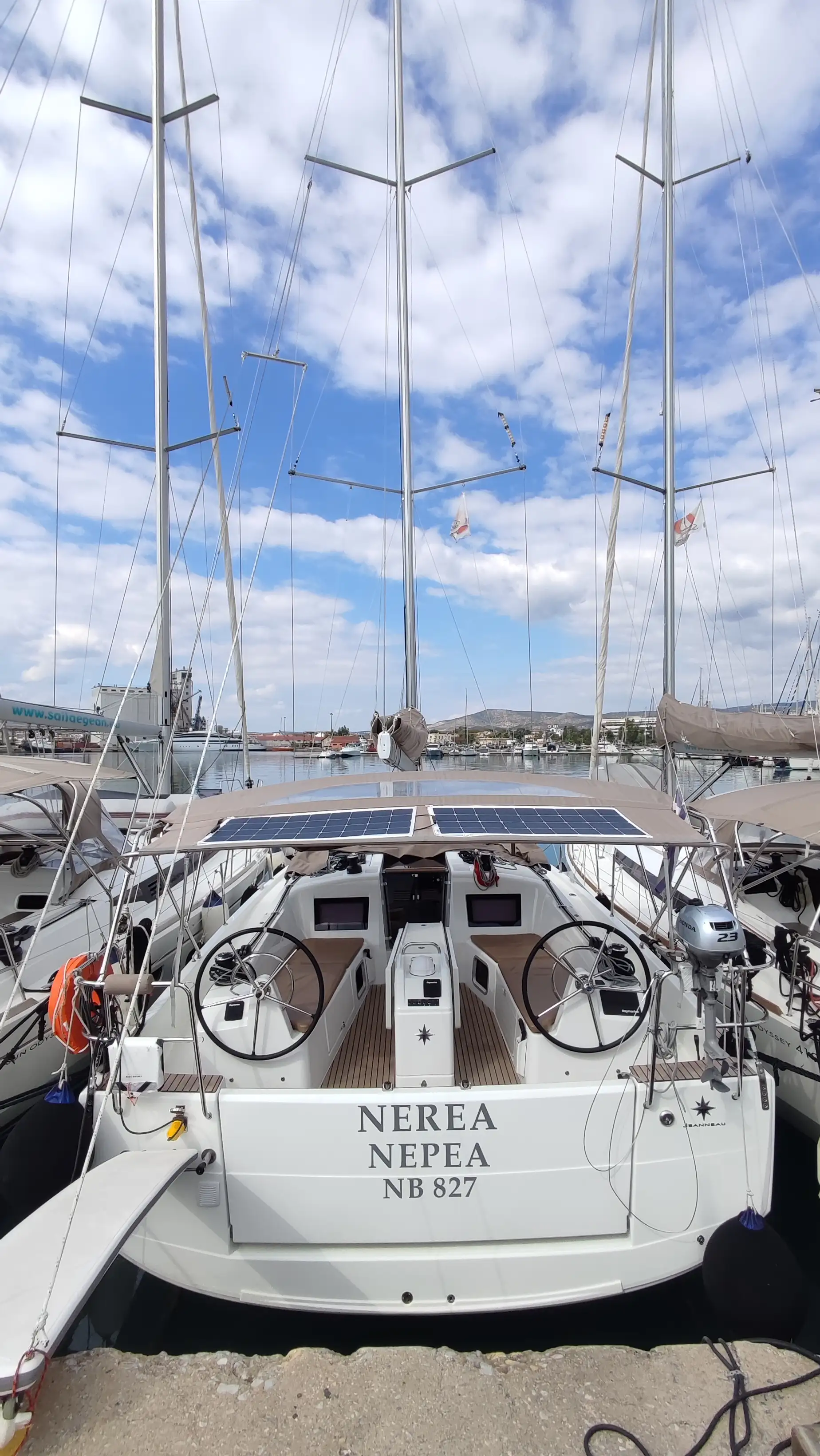 Magnífica embarcación Nerea, situada en el Puerto Loutraki, con una eslora de 12.35 m y manga de 3.99 m.