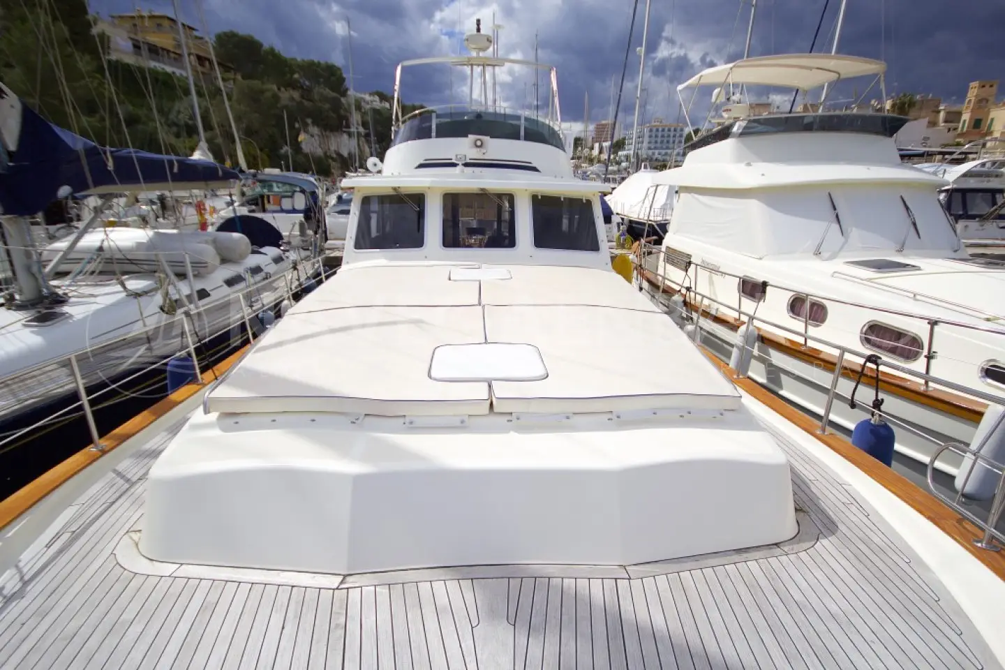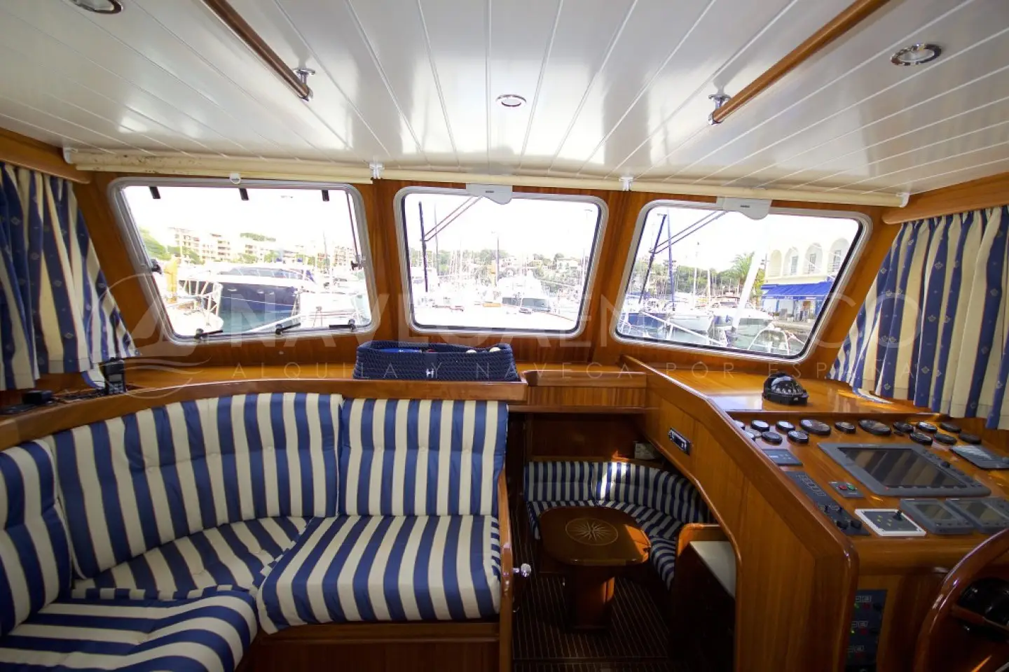 PatrónJana III es nuestro buque insignia, barco moderno de líneas clásicas, en perfecto estado de conservación, muy espacioso y con todas las comodidades (Aire acondicionado, generador, vitrocerámica, horno, microondas, 2 frigoríficos, etc.). Con 16 metros de eslora y 5 metros de manga ofrece la posibilidad de albergar a 11 pasajeros holgadamente. Su enorme solárium en proa para 10 personas y su gran flybridge hacen de él la opción perfecta para disfrutar de sus vacaciones en Mallorca.