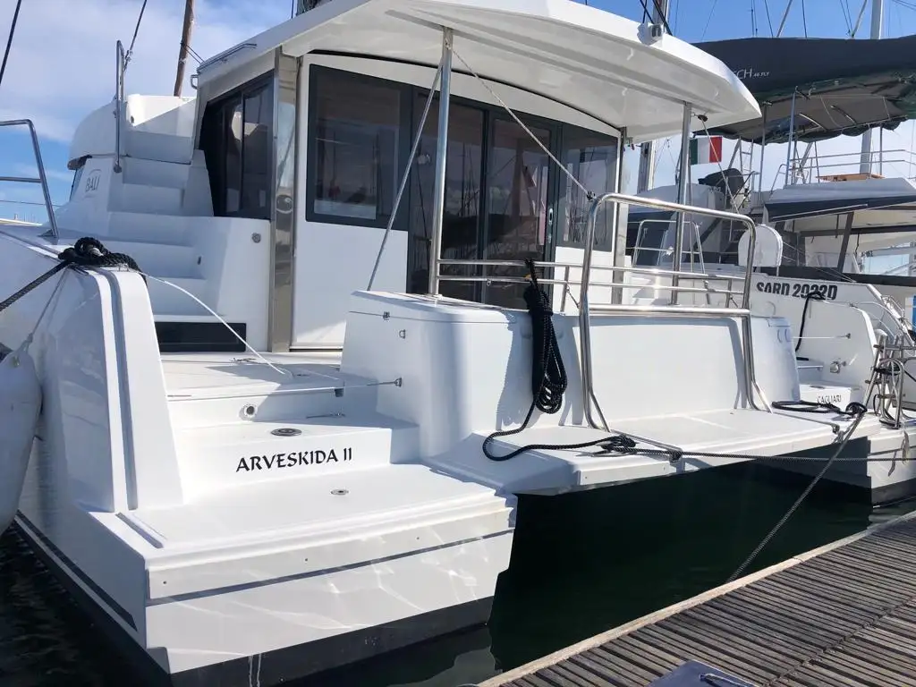 Magnífica embarcación Arveskida II, situada en el Marina dell'Isola, con una eslora de 12.85 m y manga de 7.08 m.