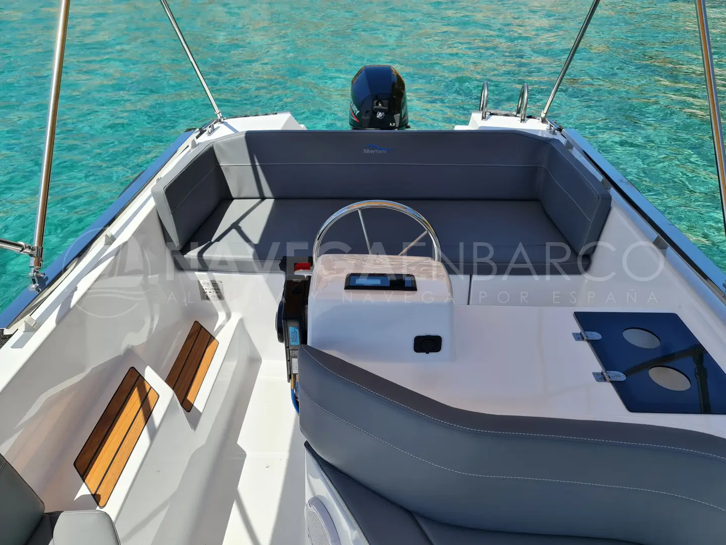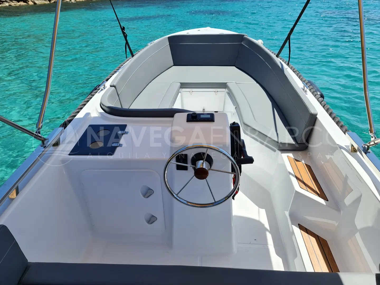 Totalmente equipada: consola lateral, motor Mercury 15 cv con trim eléctrico, solárium desmontable en proa, posavasos, toldo bimini de inox, equipo de sonido vía bluetooth, escalera de baño, tambuchos para guardar cosas.